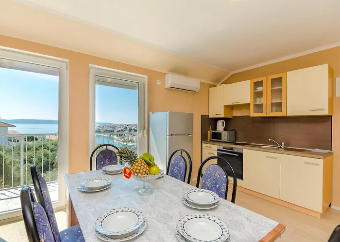 Apartmani Lorena Trogir de 56 m² comprend une terrasse et est situé à seulement 5 minutes de marche de la baie de Mavarstica. Le Château de Kamerlengo se trouve à 3 km, tandis que l'aéroport Aeroport de Split est à 15 minutes en voiture de l'appartement.